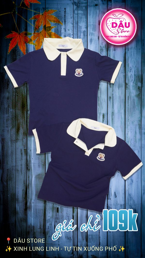 Áo Polo Xanh Phối Viền Kem Thêu Gấu